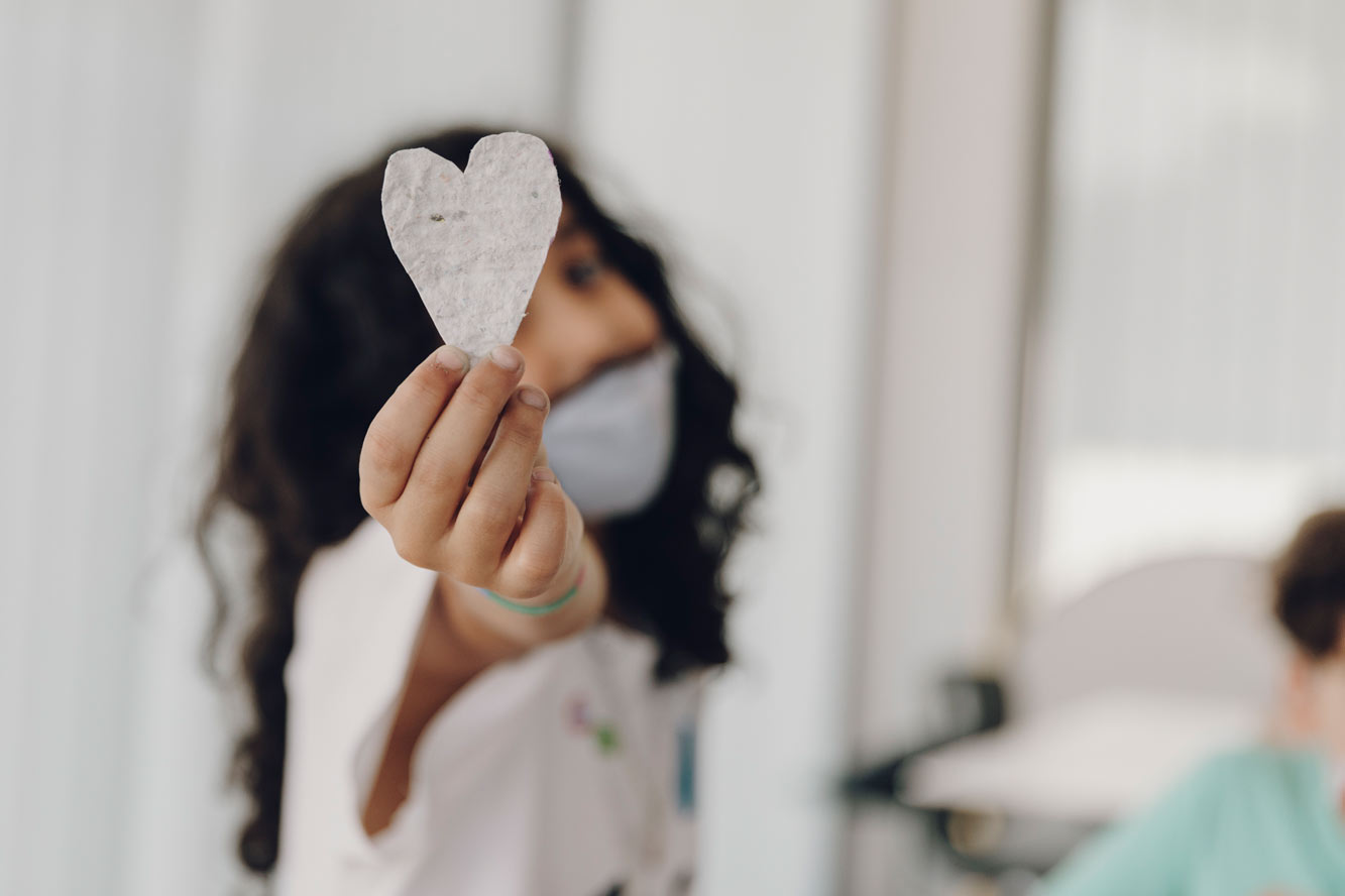 Wie sich das angefühlt hat, auch darüber wird anschließend wieder im Projektraum gesprochen. Und dann endlich: Die recycelten Papierbögen aus der Vorwoche werden verteilt. Inés bastelt sich ein Herz daraus, Johanna schreibt ein paar Zeilen an ihre Freundin, Sebastian schneidet sich grinsend eine Form zurecht, die er lieber nicht in die Kamera halten will. Manchmal ist auch Quatsch erlaubt.
